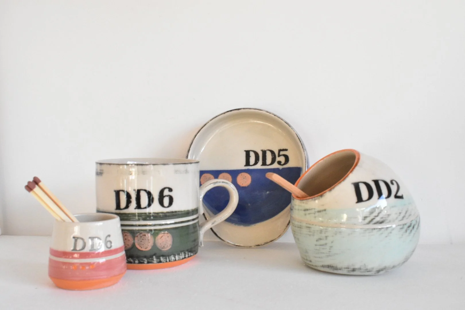 The bold, coastal colours and typography blend beautifully with the patinas reminiscent of boats and seaside buildings, making each piece tell a story of the sea.